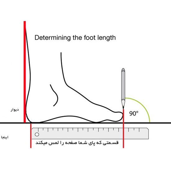 راهنمای اندازه گیری طول پا : ابتدا پای خود را روی سطح یا کاغذ صاف قرار دهید ، سپس بزرگترین انگشت پا و پشت پا را روی سطح علامت بزنیدو بعد فاصله به دست آمده برابر است با طول پای شما که با در نظر گرفتن جدول سایزبندی میتونید سایزمورد نظر خودتونُ انتخاب کنیدتوجه داشتیه باشید نیم سانتی متر باید بزرگتر انتخاب کنیدمثلا اگر طول پا ۲۷ سانتی متر باشه باید سایز ۲۷،۵ انتخاب کنید محل قرارگیری راهنمای سایز در برگه محصول
